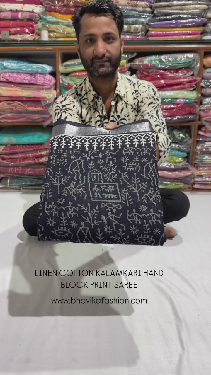 Introducing our Kalamkari Black Hand Block Linen Cotton Saree, carefully crafted with intricate block printing techniques. Made from a blend of linen and cotton, this saree offers a lightweight and breathable fabric that drapes beautifully. The set includes a matching blouse piece for added convenience and versatility. Elevate your traditional wear with this stunning saree.